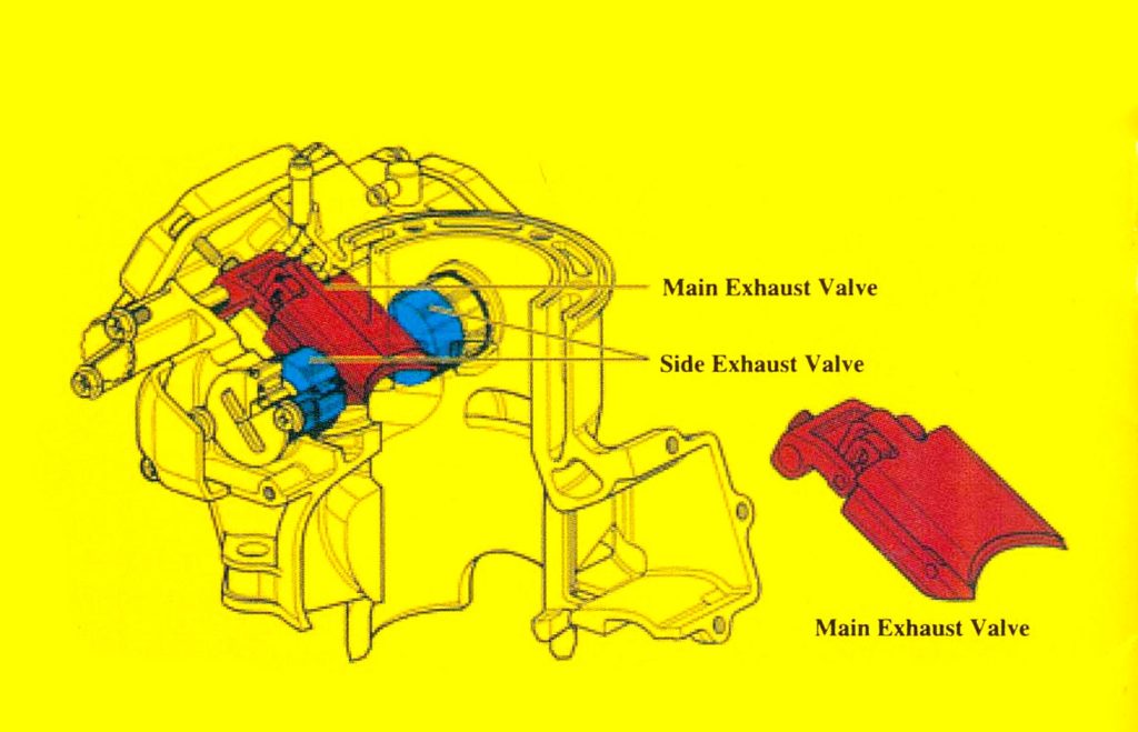 A redesigned power valve for 2001 moved to a dual-valve design to provide smoother power and more precise port timing control. Photo Credit: Suzuki