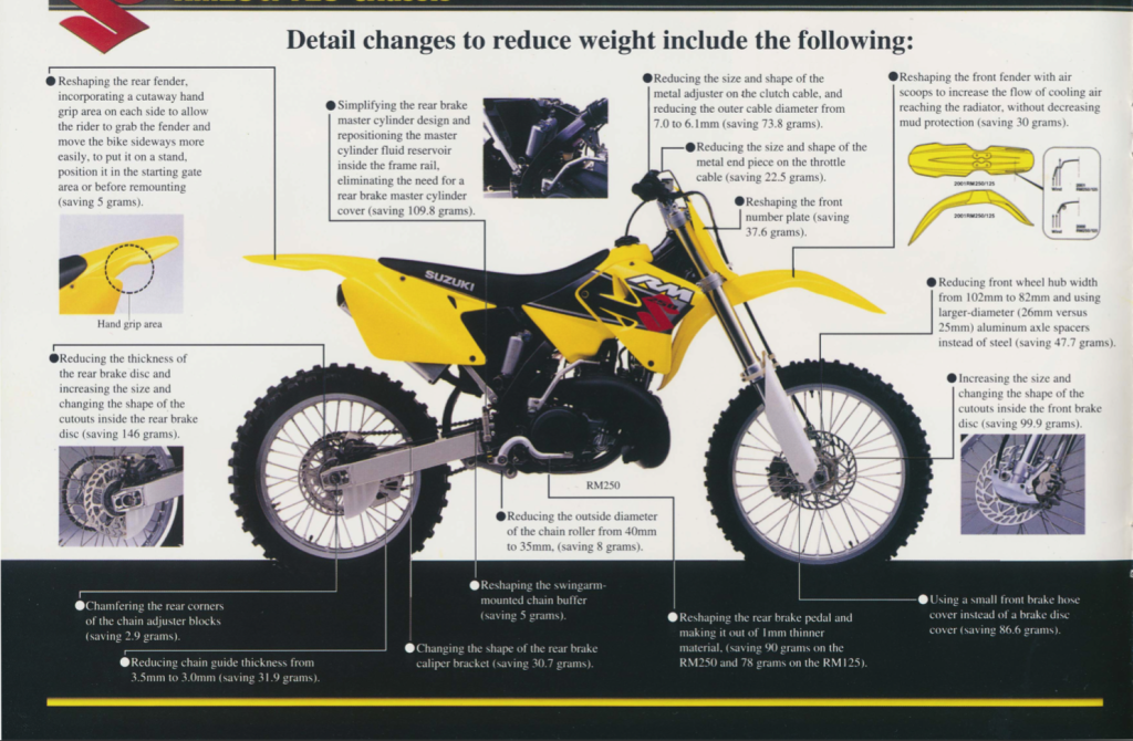 Suzuki took great pains to slim, tuck, and trim every component on the new RM in search of reduced weight. The result was a remarkable 9-pound weight reduction from the 2000 model. Photo Credit: Suzuki