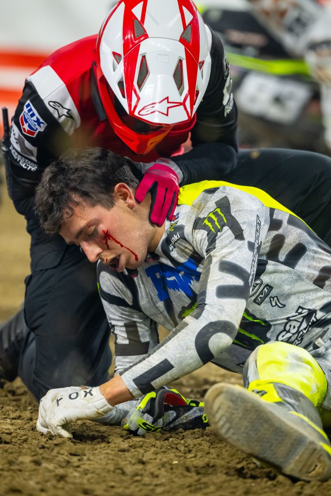 Red Flag Drama: Hopefully NO ONE is debating why the AMA threw the red flag out there because if you’re wondering why then look at this photo. Rider safety “should” be paramount”. Does this look like a man that is good? NO! I don’t disagree with the red flag being thrown, but the AMA rule of time on the clock so it’s a staggered restart needs to be looked at (especially if the heat race has a different rule). I do think Max got screwed out of this win and I understand why he would be bummed. If AMA called the race with 7 seconds on the clock, I don’t think ANYONE would have protested because Max was over six seconds up on Kitchen. Now, if Kitchen was on Max’s ass and the red flag was thrown, would anyone be bitching about the red flag restart rule? PROBABLY NOT! Everyone would probably want a restart and Max would probably be not as pissed. Especially the fans because they would get a good race (or at least get that good race, that was happening before the red flag to at least play out). But because Max had a huge lead and he didn’t win, he is pissed, fans are pissed and even some media are pissed (which I think is comical). Should the red flag rule change for the main event? YES! Should people be pissed off because of the restart? Some, should yes and it’s understandable. Should AMA have thrown out the red flag? YES! Let’s hope at some point the rule evolves because of this. Live and learn. I am trying to be positive with the AMA here people.