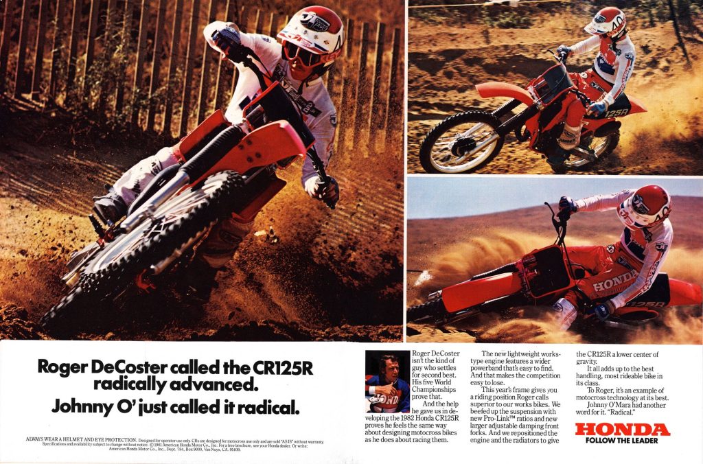 After retiring from full-time racing at the end of the 1980 season, 5-time World Motocross champion Roger De Coster moved in-house to help develop Honda’s production motocrossers. The much-improved 1982 CRs were the first to benefit from The Man’s wisdom and expertise. Photo Credit: Honda