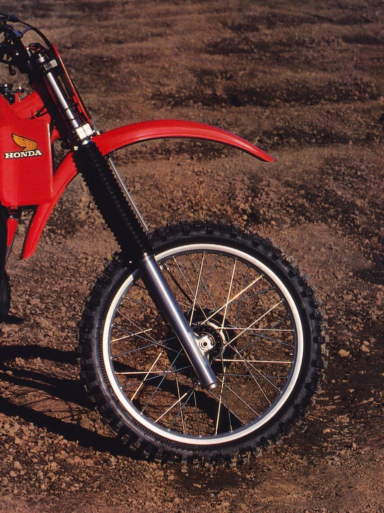 Up front, the 1982 CR125 added an all-new set of 38mm Kayaba forks. In 1982, these were significantly smaller than the 41mm forks found on the Kawasaki KX125, but par for the course in the 125 class. The new forks offered all-new valving and three external adjustments for compression damping, a significant upgrade for the time. There was no available adjustment for rebound control, but most forks in 1982 offered little if any external adjustments aside from air pressure. The new forks protruded 20mm less below the axle to prevent them from catching in ruts and featured 12.6 inches of overall travel.