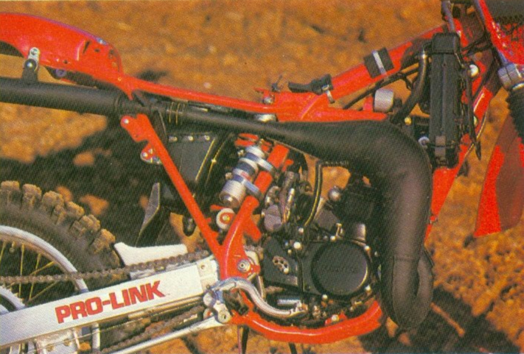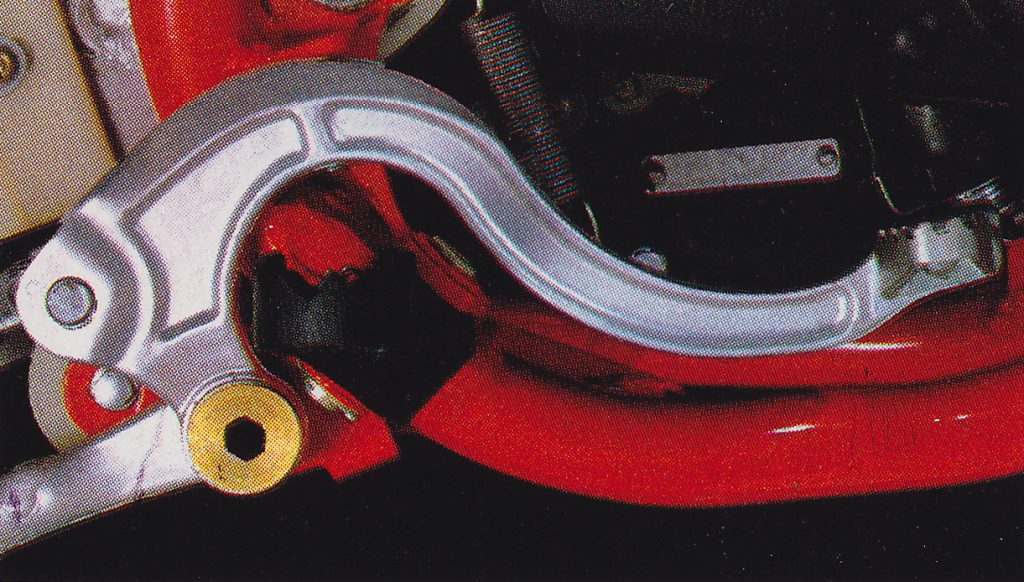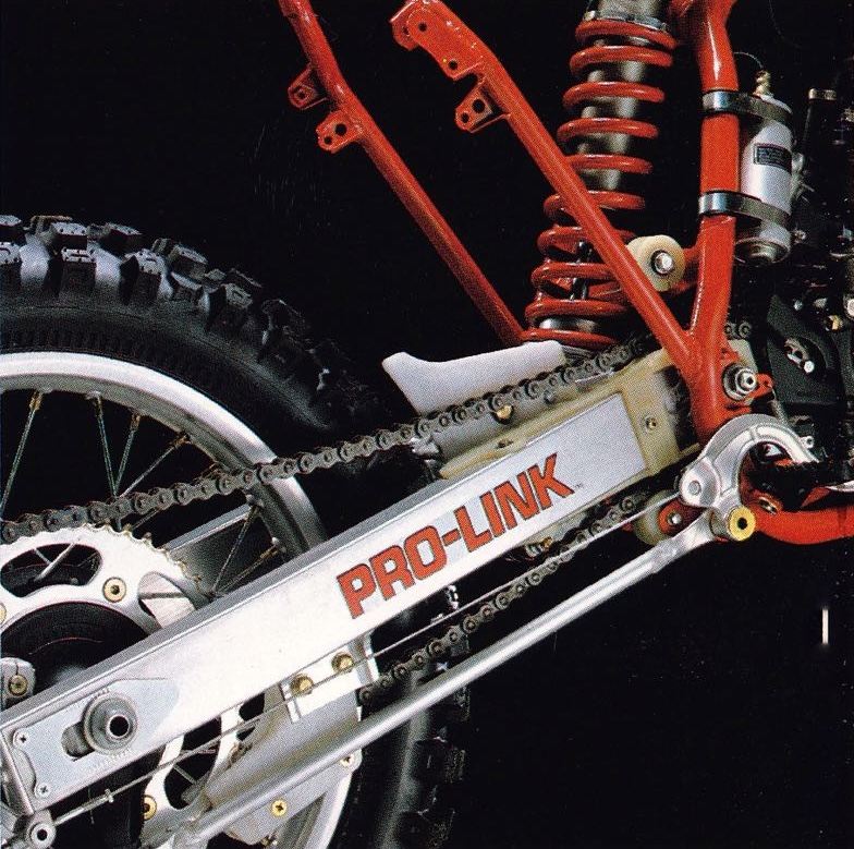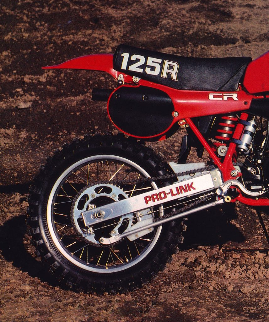 A redesigned Pro-Link rear suspension system for 1982 featured a stronger box-section swingarm, revamped linkage, and all-new compression-adjustable Showa damper. Photo Credit: Honda