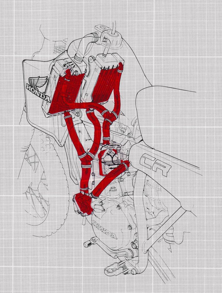 In addition to the new name, the 1982 CR125R received serious upgrades in nearly every facet of its design. In 1981, one issue that had plagued the 125 Honda was overheating. The new water-cooling system pumped all the hot coolant coming out of the motor into the right radiator, then circulated that coolant into the left, before returning it to the water pump. In practice, this proved inefficient at removing heat from the high-strung 122cc mill.