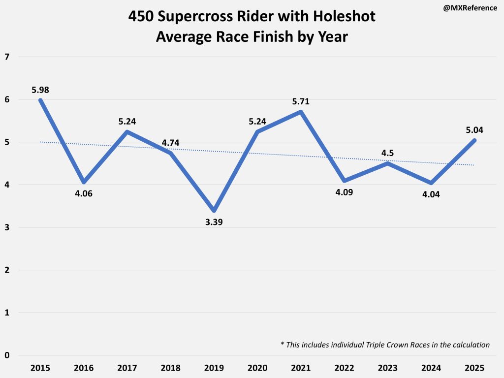 The rider with the holeshot in 2025 had an average race finish of 5.04.