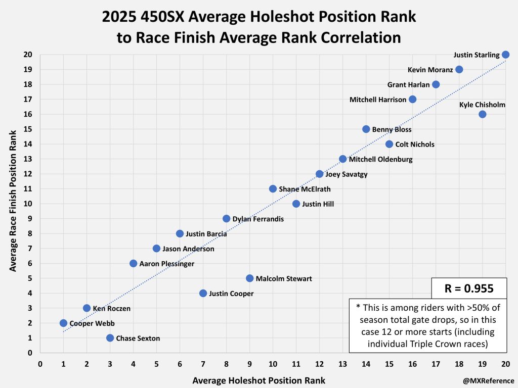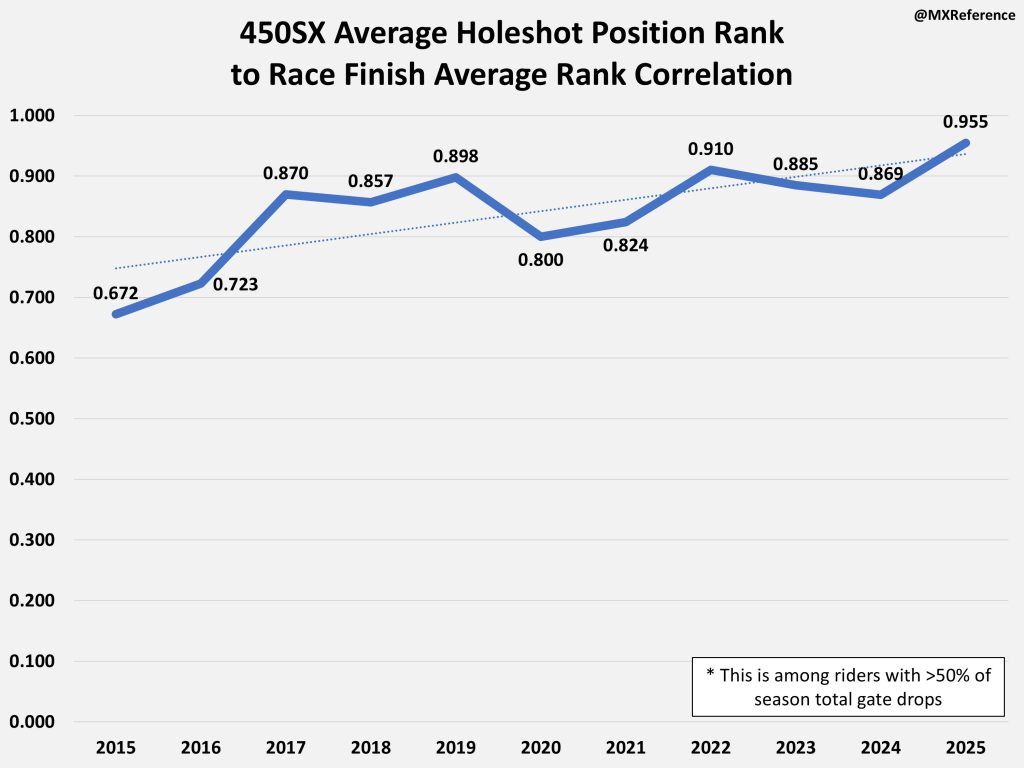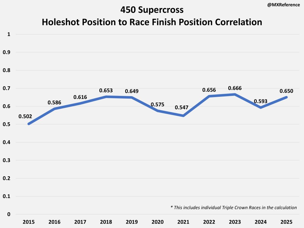 So its hard to say whether or not the 2025 season was more or less start dependent. I think it is definitely fair to say for the Top 5 spots in a main event it was less start dependent. Again, mostly due to injuries of the factory riders throughout the year. But after the factory riders it seems to be more correlated than previous years.