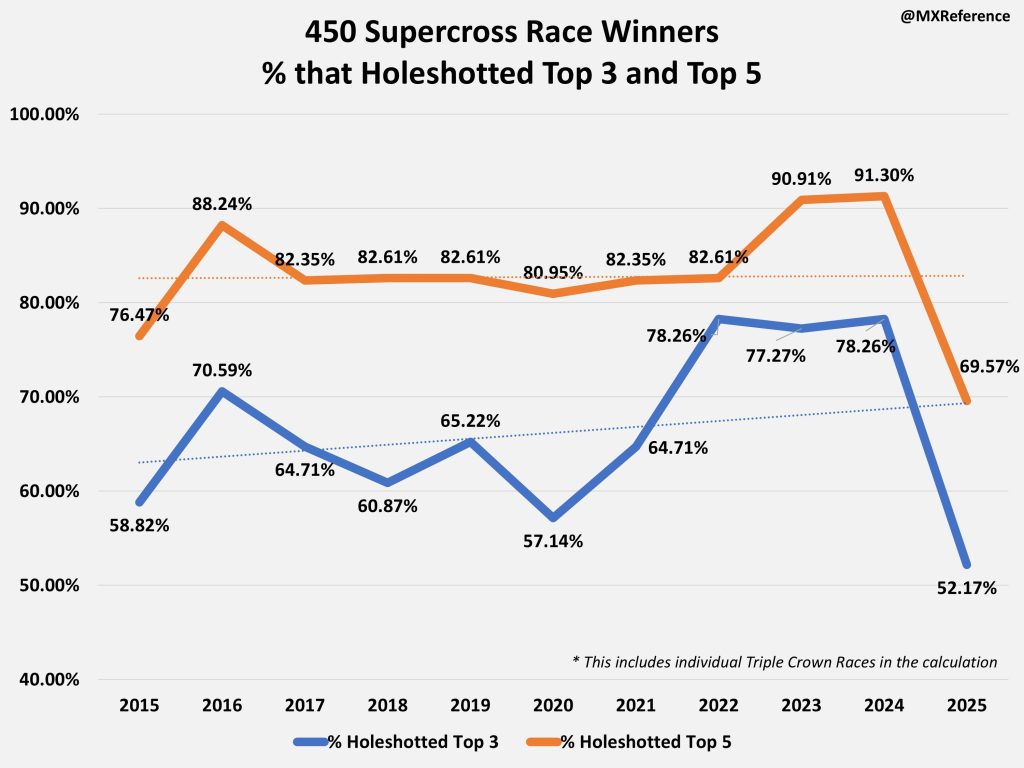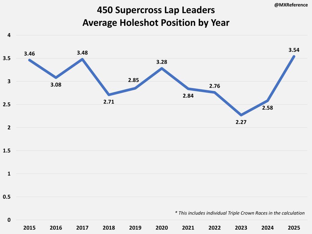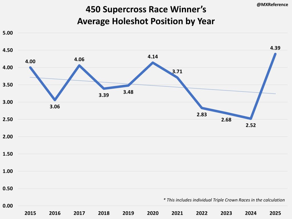 In recent years, the 450 Supercross class has felt very start dependent – “Startcross.” While the starts are have always been incredibly important, last year felt especially this way. And the data showed it – so how does 2025 compare to the last 10 years of Supercross?