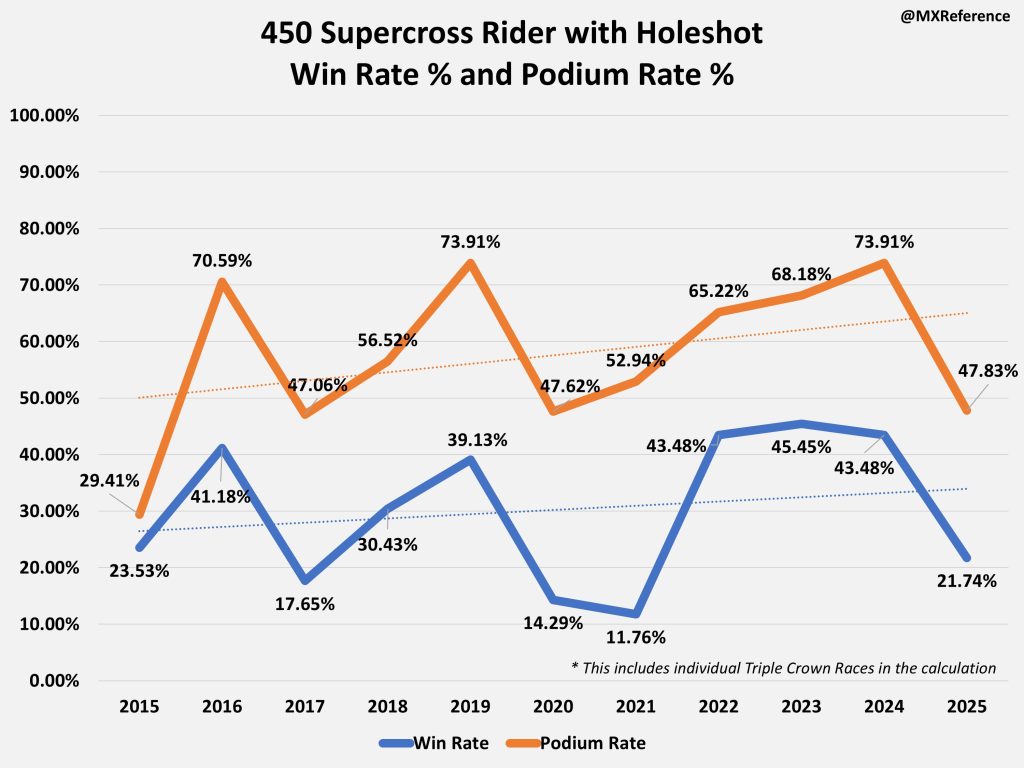 Furthermore, last year the rider with the holeshot was on the podium nearly 75% of the time. This year? Just under half the time at 47.83%.