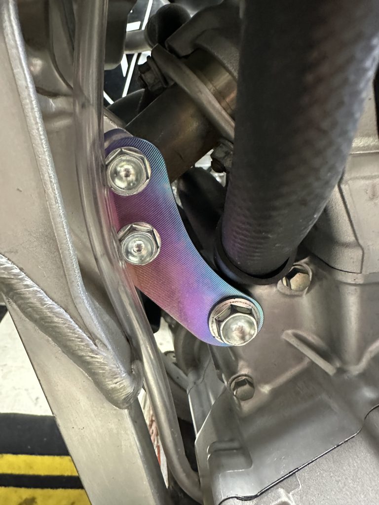 The 2025 KX250 chassis has better front tire contact in corners over the 2024 machine but also is stiffer on bump touch and has more deflection/twitchiness than the older less stiff Kawasaki chassis. Aden has been complaining about some deflection on throttle and and an unstable front end feel immediately when chopping the throttle while setting up for corners. These are the areas that we were looking to improve and with the FCP engine mounts installed we got some of these areas of concern better.