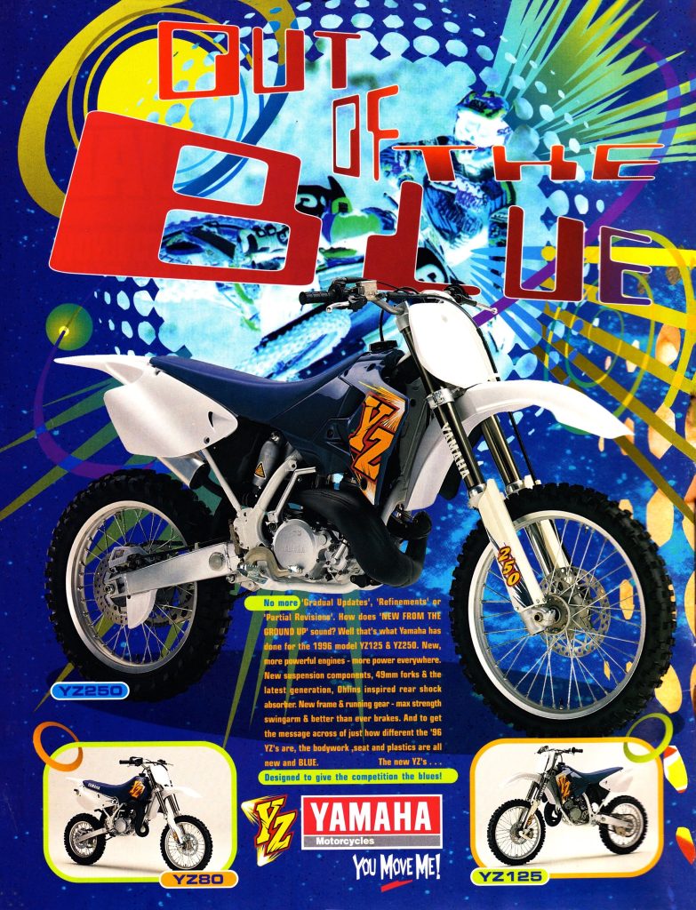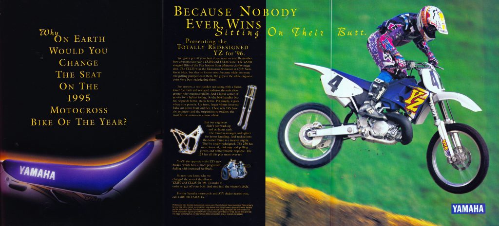 The 1990s were nothing if not bold, and boy howdy, Yamaha’s ad department was not afraid to uncork an optical assault to make sure you knew they had an all-new YZ125 and YZ250 on deck for 1996. I am sure this ad caught the eye of many readers as they flipped through the magazines, but I think it may have taken things a bit too far, as it is difficult to read and does not do a particularly good job highlighting the styling of the all-new machines.