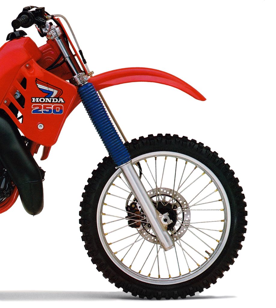 Largely unchanged from the year before, the CR’s 43mm damper-rod Showa forks continued to be mid-pack performers. Softy sprung, harsh in the midstroke, and prone to bottoming, they benefitted greatly from some aftermarket assistance. Photo Credit: Honda