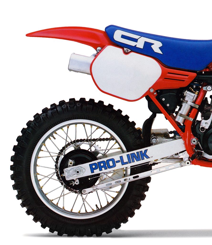 In the rear, the new chassis featured a total revamping of the CR’s proven Pro-Link single-shock suspension system. An all-new linkage moved to a flatter progression curve and featured upgraded bearings throughout. All the main linkage pivots were changed from bushings to needle roller bearings to provide a smoother and more precise action. The Heim-type mounting point for the shock was also upgraded to reduce the play and annoying “clunk” riders felt when loading or unloading the suspension. An all-new extruded aluminum box-section swingarm featured a tapered design for the best combination of weight savings and strength.