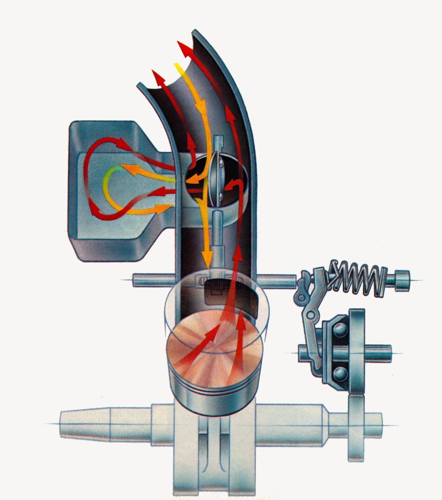 In 1984, Honda introduced its first version of a “power valve” in the form of the Automatic Torque Amplification Chamber or ATAC. The ATAC consisted of a centrifugal ball-ramp governor, exhaust valve, and small resonance chamber. By opening and closing this exhaust valve, Honda’s engineers were able to alter the volume of the exhaust header to optimize power and provide a boost of torque at low RPM. Photo Credit: Honda