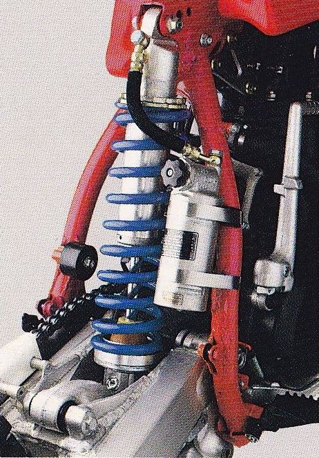 An all-new Showa damper offered more travel, increased oil capacity, and a larger shock body and piston for 1985. Photo Credit: Honda