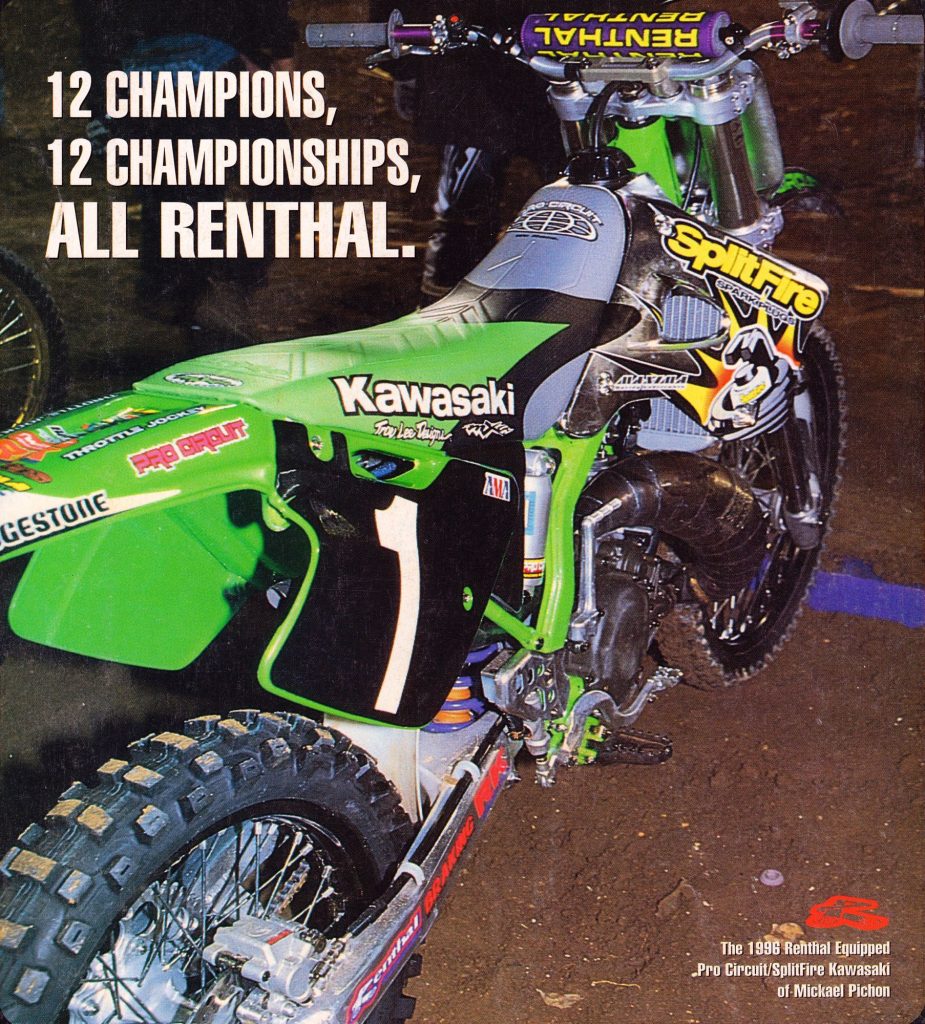After Honda pulled its support in 1993, Mitch’s Pro Circuit team was left looking for a new partner. Coming to their rescue was Kawasaki, who has retained that relationship ever since. While the color of the machines changed, PC’s winning ways did not. Suzuki mini star Jimmy Gaddis secured the newly renamed Hot Wheels Pro Circuit Kawasaki squad a 125 West Coast Supercross championship in 1993 and France’s Mickaël Pichon brought Renthal and Pro Circuit two more titles in 1995 and 1996.