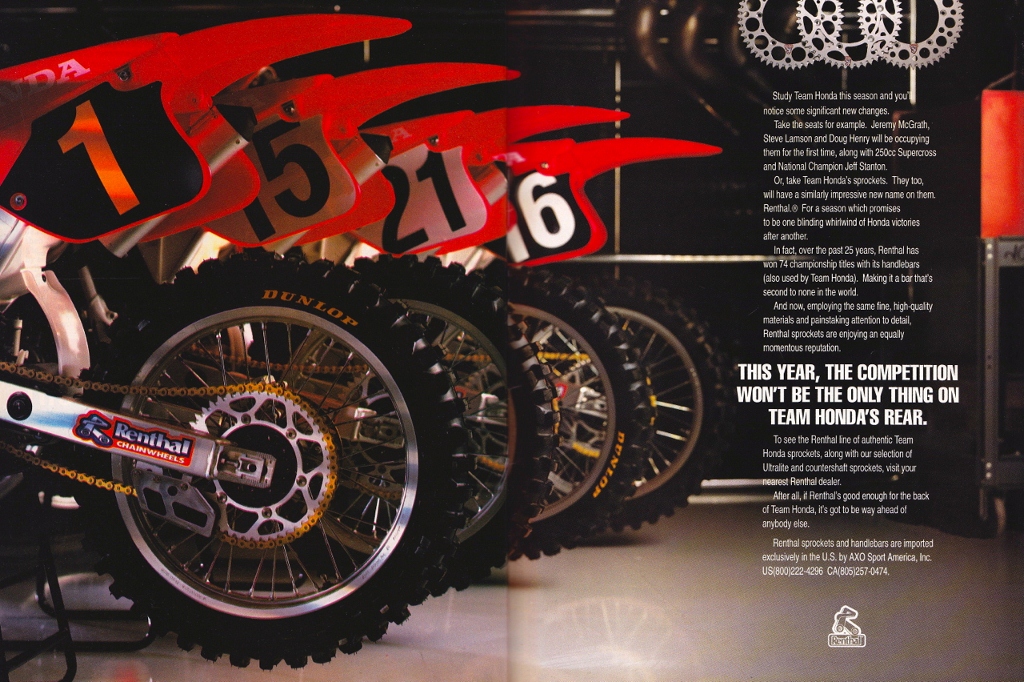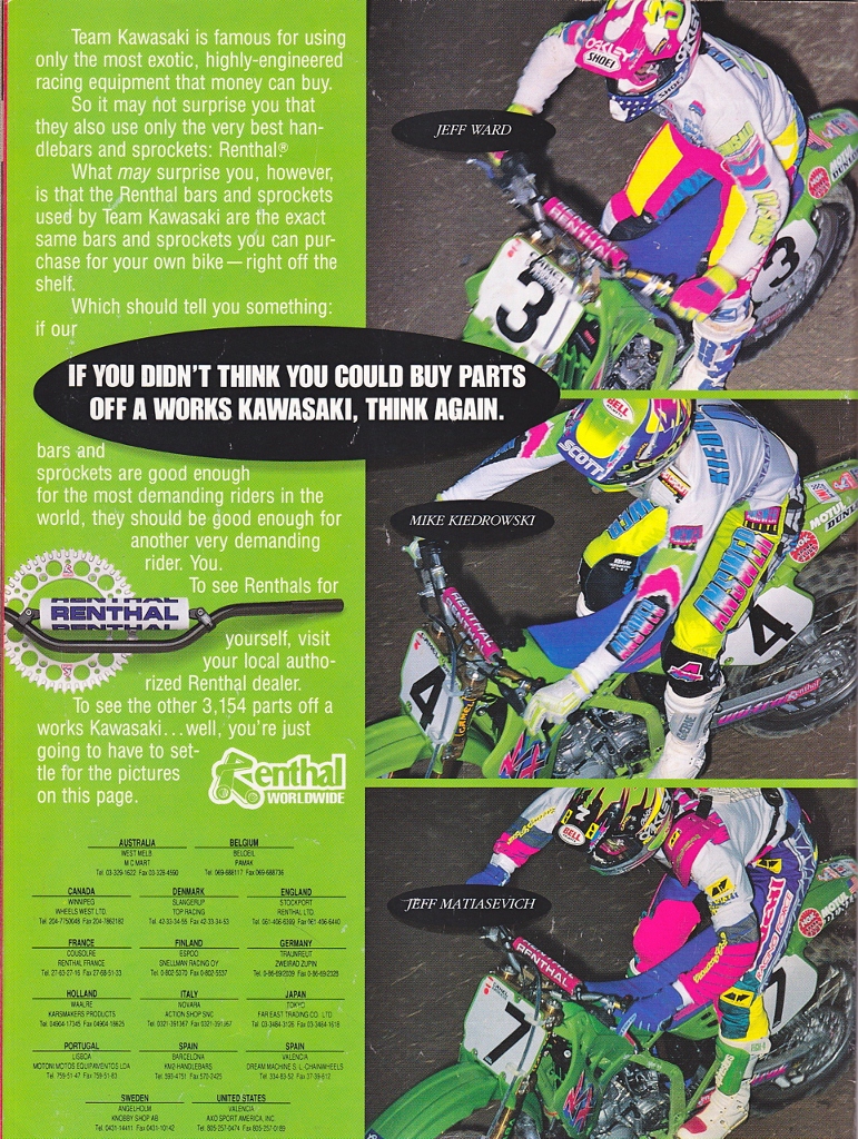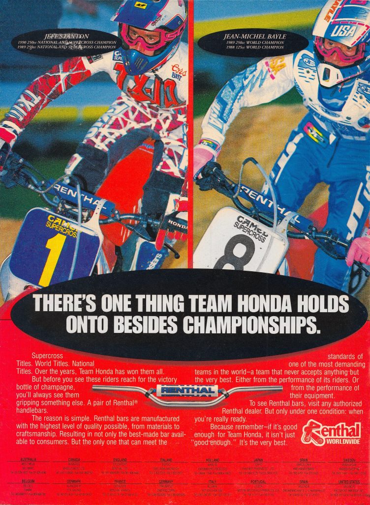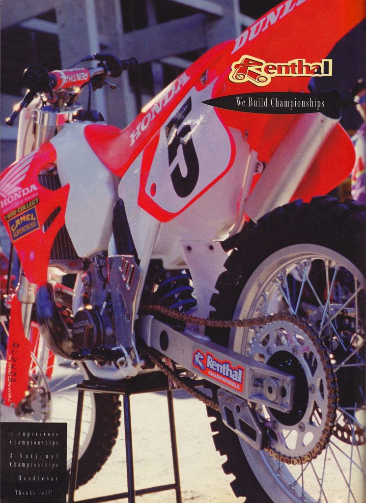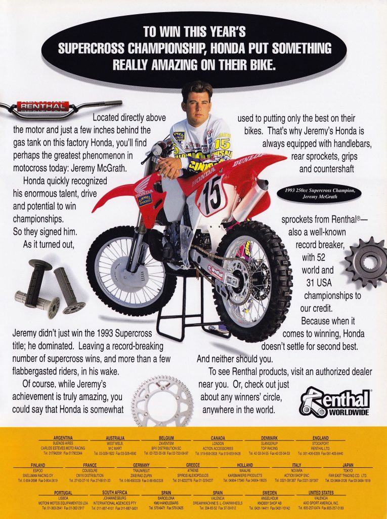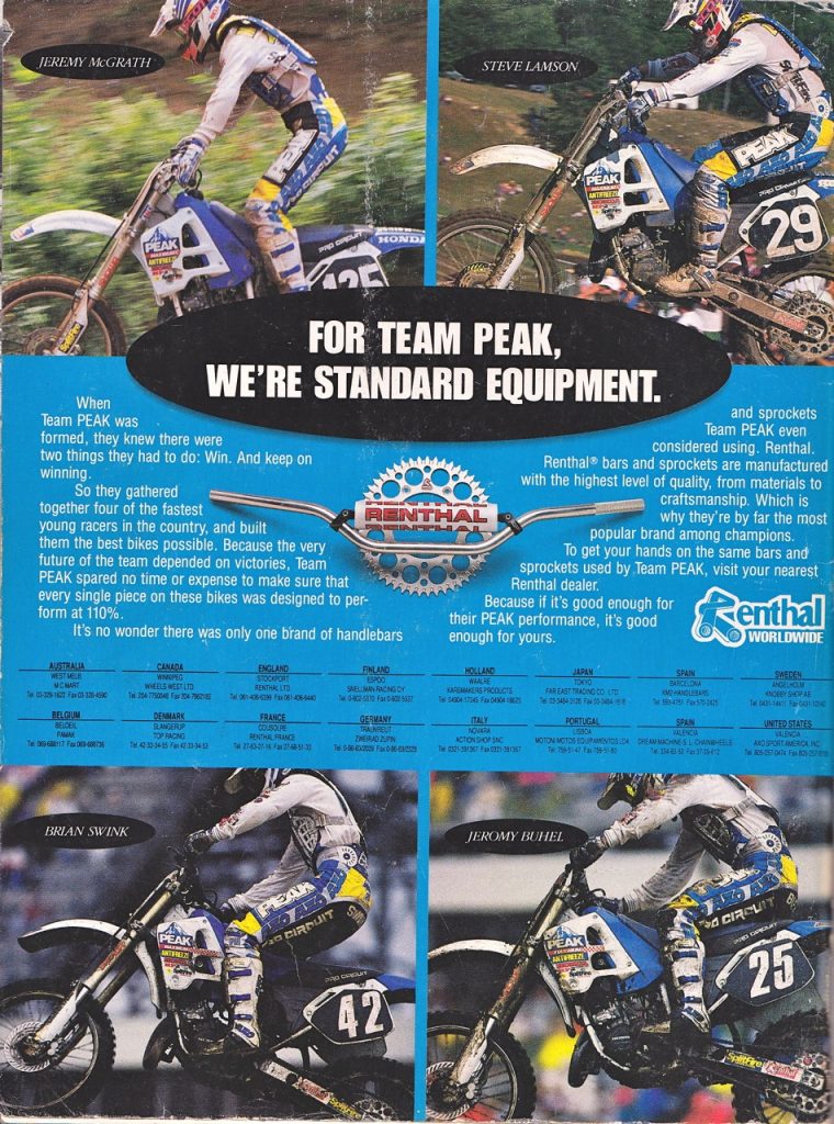 In 1991, Honda moved their 125 program to Mitch Payton’s Pro Circuit team and he fielded a Renthal-backed quartet of riders that exceeded even the most optimistic of expectations. Jeremy McGrath, Brian Swink, Steve Lamson, and Jeromy Buehl (misspelled in the ad above) captured both the 125 East Coast and 125 West Coast Supercross titles for Peak Pro Circuit and Renthal.