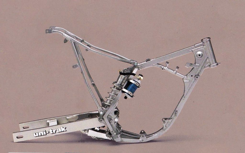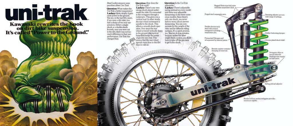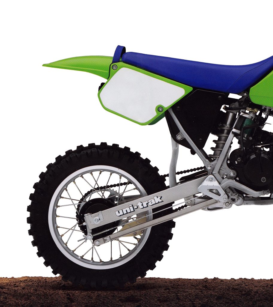 Give the dog a bone: Introduced in 1980 on the full-sized KX models, Kawasaki’s Uni-Trak was the first linkage suspension system to make it to production from the Japanese. In 1986, Kawasaki finally retired their original “dog bone” linkage design for a Honda-style bottom link that saved weight, improved handling, and simplified component packaging. Photo Credit: Kawasaki
