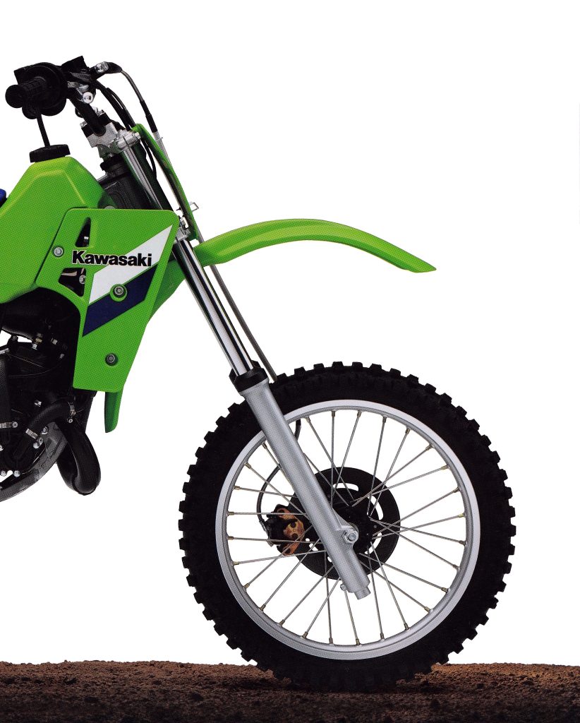 All-new forks for 1986 offered 2mm larger stanchions and nearly an inch of additional travel. While beefy and flex-free, their soft springs and light damping were out of step with the firmer settings found in the rear shock. Photo Credit: Kawasaki