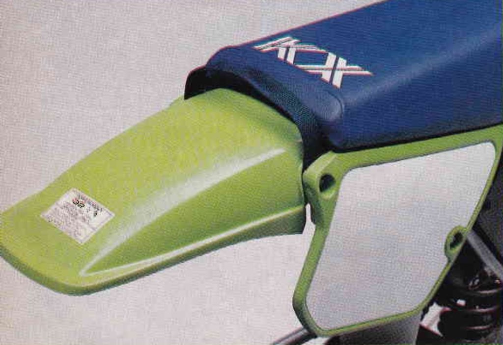 Redesigned bodywork for ’86 offered larger side plates, a flatter seat, a slimmer tank, and increased roost protection from a larger rear fender. Photo Credit: Kawasaki