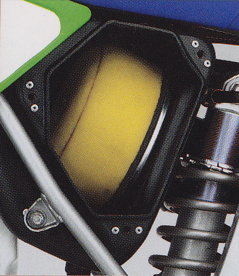 Repositioning the Uni-Trak hardware below the shock allowed Kawasaki’s engineers to increase the size of the airbox and straighten the intake tract for 1986. Photo Credit: Kawasaki