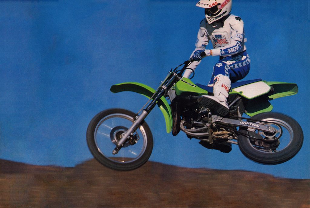 The revamped Uni-Trak delivered a firm but well-controlled ride in 1986. Big jumps and large whoops were no issue for the new bottom-link suspension. Larger and faster kids loved its performance, but smaller and less skilled pilots found its lack of low-speed compliance and comfort less appealing. Photo Credit: Kawasaki