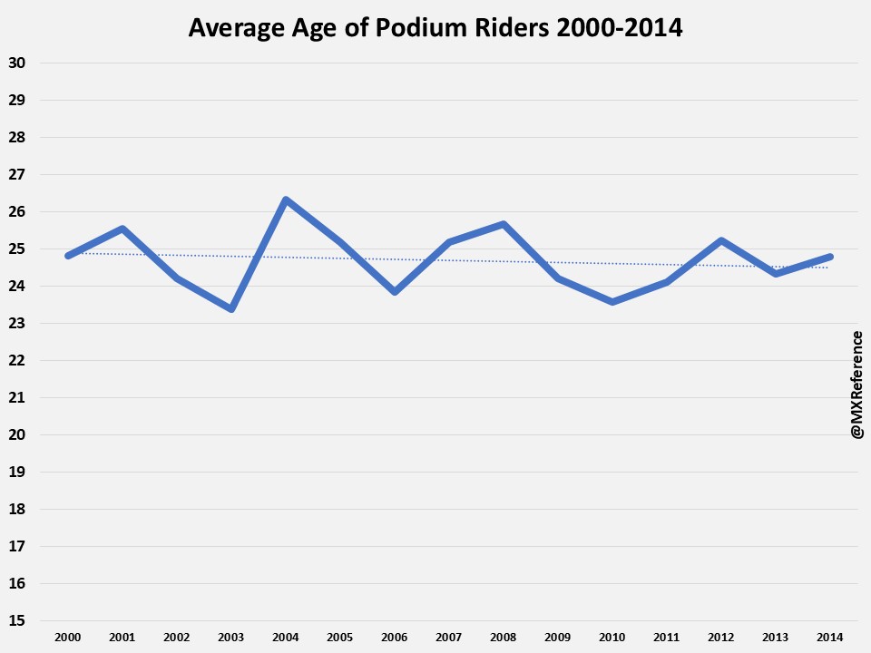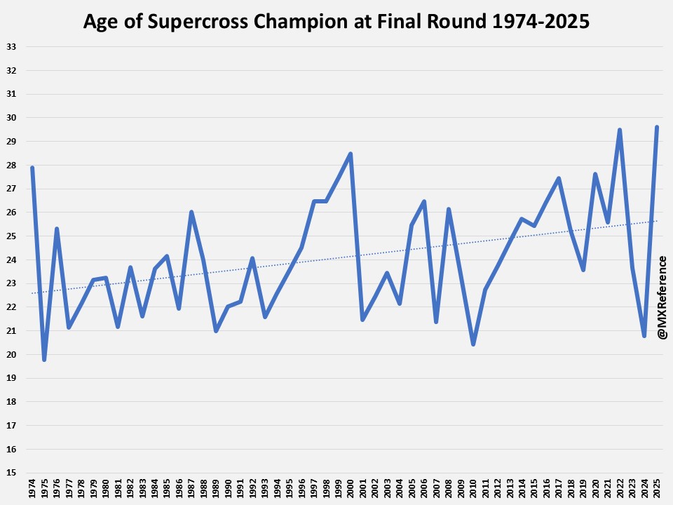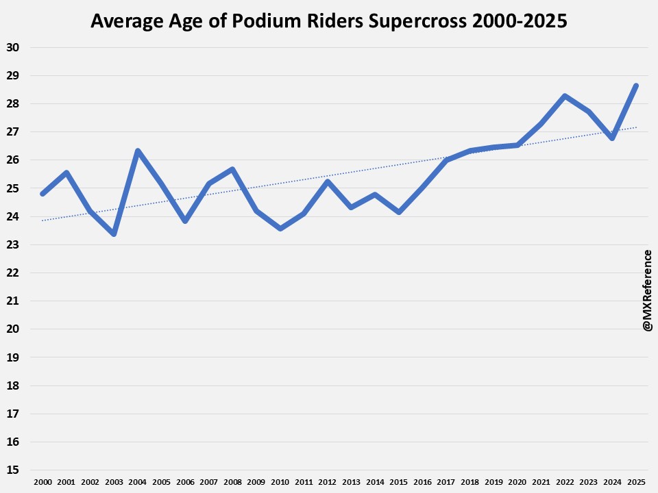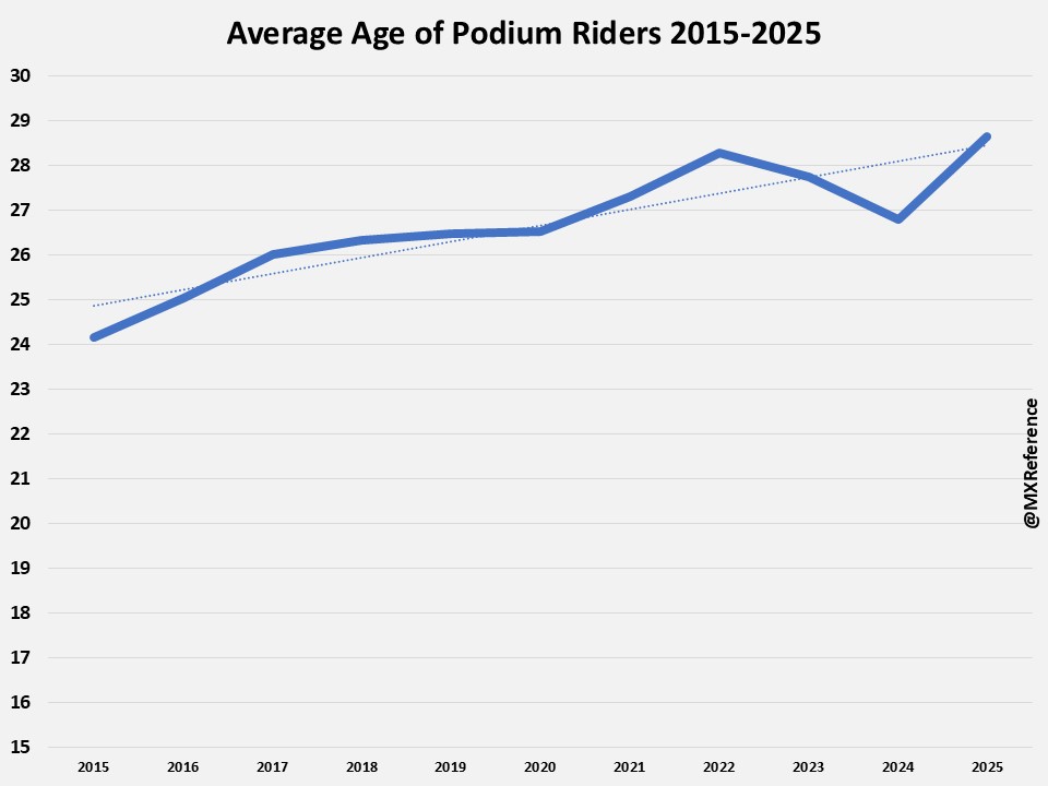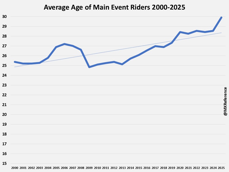 A pretty big jump from 2015! From right over 24 to just under 29 on average! I think the 2024 dip is almost solely due to Jett Lawrence’s young age, but the trend is still there.
