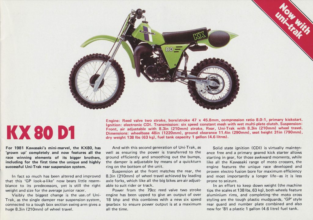 The KX80 picked up the big bike’s Uni-Trak for 1981, but its performance was not yet the class dominator it would become a year later. The green mini was a good bike for beginners, but most racers seemed to prefer the performance offered by the yellow alternatives in 1981.