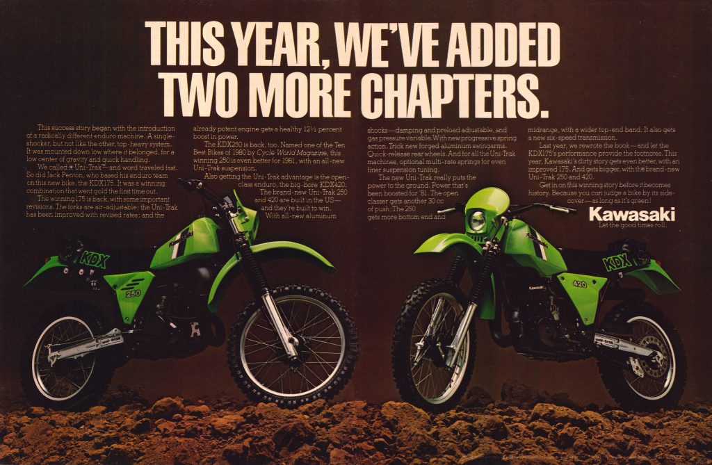 In addition to the KDX175, Kawasaki offered a middleweight 250 and big bore 420 for woods warriors looking for a bit more power in 1981.