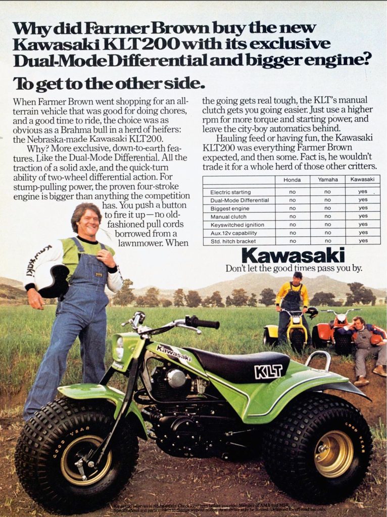 The sporty Tecate was still a few years away in 1981 with the Farmer Brown approved KLT200 as Kawasaki’s main ATC competitor. Even by 1981 standards, the KLT was a pretty odd-looking machine. Honda reportedly held several patents on the original ATC design so competitors like Kawasaki and Yamaha had to come up variations that were not always ideal for weight distribution and handling.