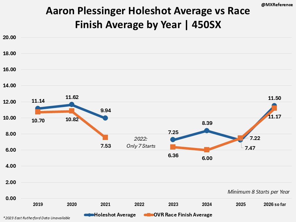 Aaron Plessinger has been very consistent with his holeshot averages nearly matching his race finish averages. Only in 2025 is his overall finish average slightly worse than his holeshot average. With how close his figures are, it shows across a season the Cowboy will pretty much finish where he starts.