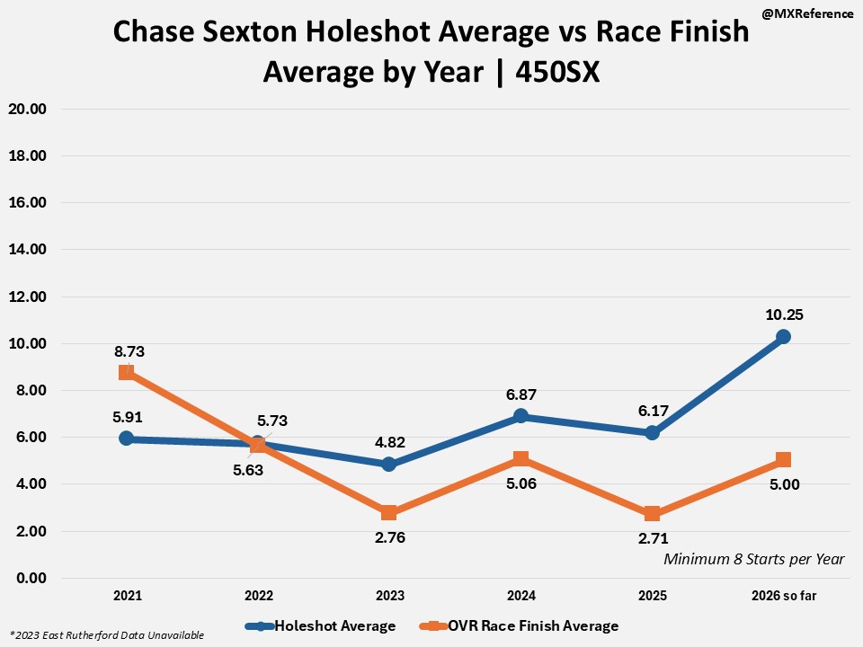 Chase Sexton’s holeshot starts this year have not been good compared to the rest of his career. Starting in 2022, his averages move in the same direction, but the jump in holeshot average this year really stands out.
