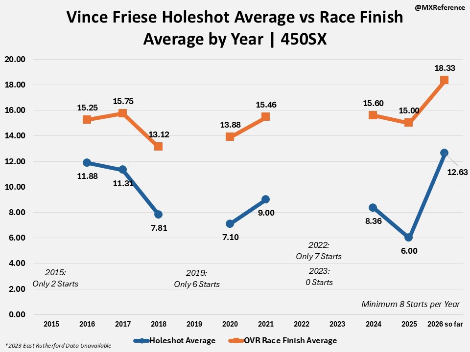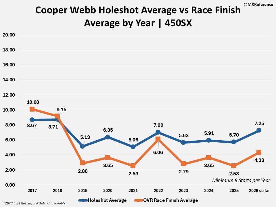 Ken Roczen has just one season where his average finish is worse than his average holeshot position – 2022. This was Roczen’s final season with Honda where he won A1 and then really struggled. So far in 2026, he is off to his worst average holeshot position. This will likely come down in average, however, his holeshots have been very volatile so far in 2026: 8-2-14-1-21-22-3-6. Hopefully, Roczen can continue his success so far in 2026 through the whole season.