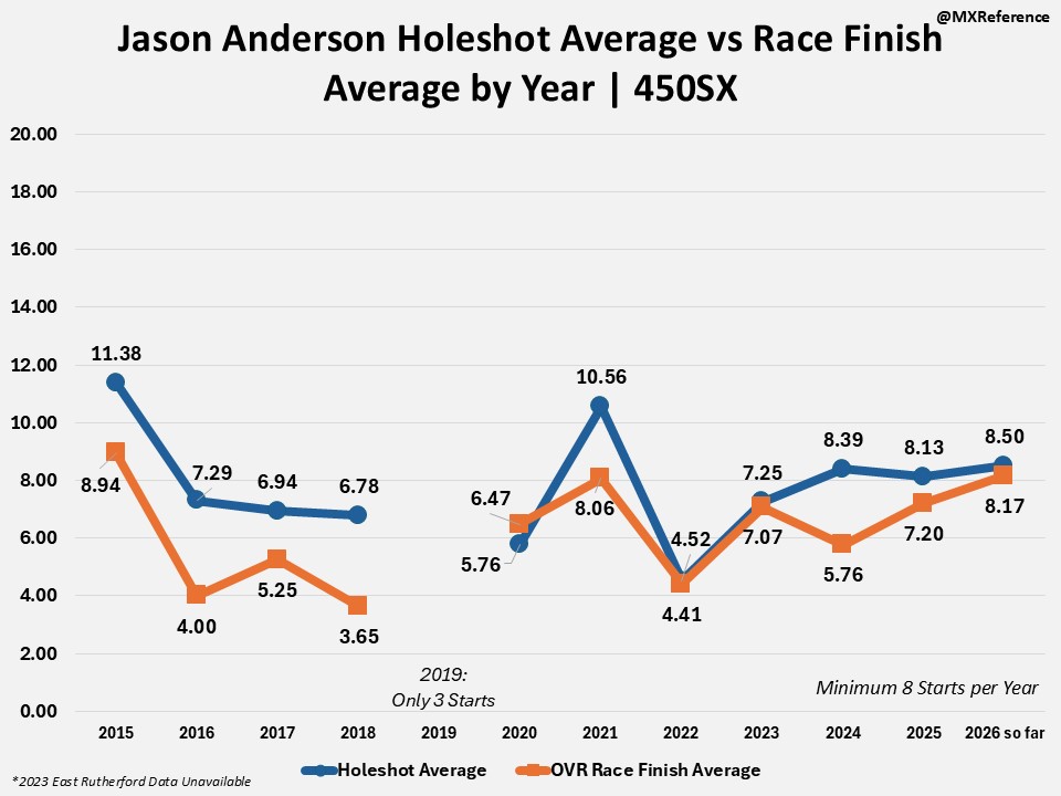 Jason Anderson has been pretty consistent over his career in the 450 class, only 2021 stands out for his holeshot averages. 2020 is the only season where his average finish is worse than his holeshot average. Since 2022, his average finish and holeshot positions are extremely close (2024 not as much).