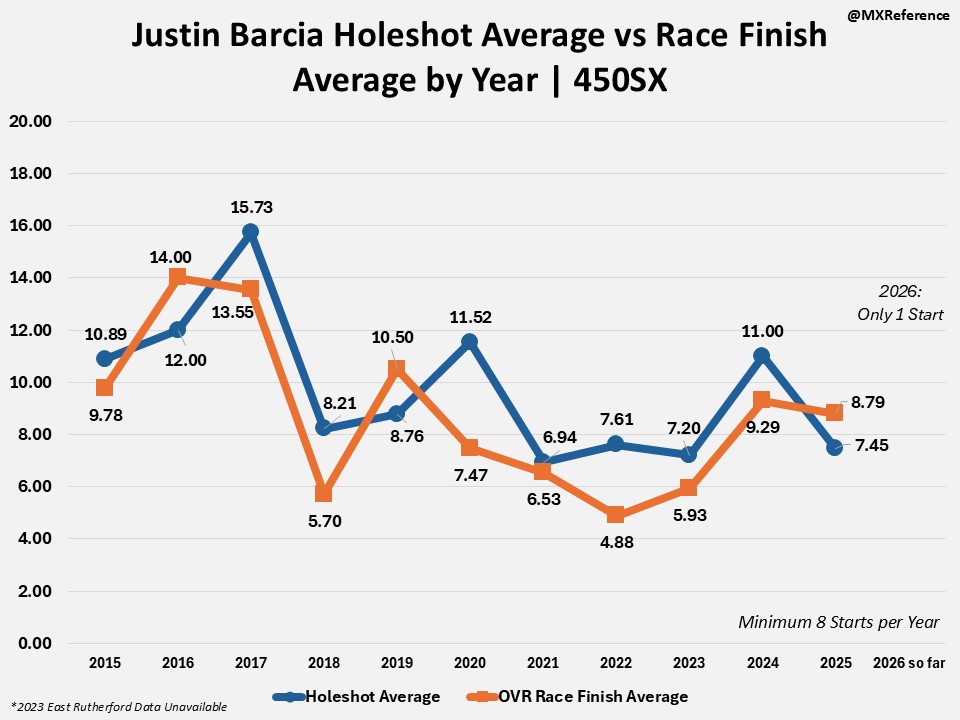 Justin Barcia has finished better than his holeshot average in all but 3 seasons: 2016, 2019 and 2025. Barcia’s chart shows a lot of volatility as a whole with a lot swings each direction. Since 2021, his starts have been much improved – except for 2024.