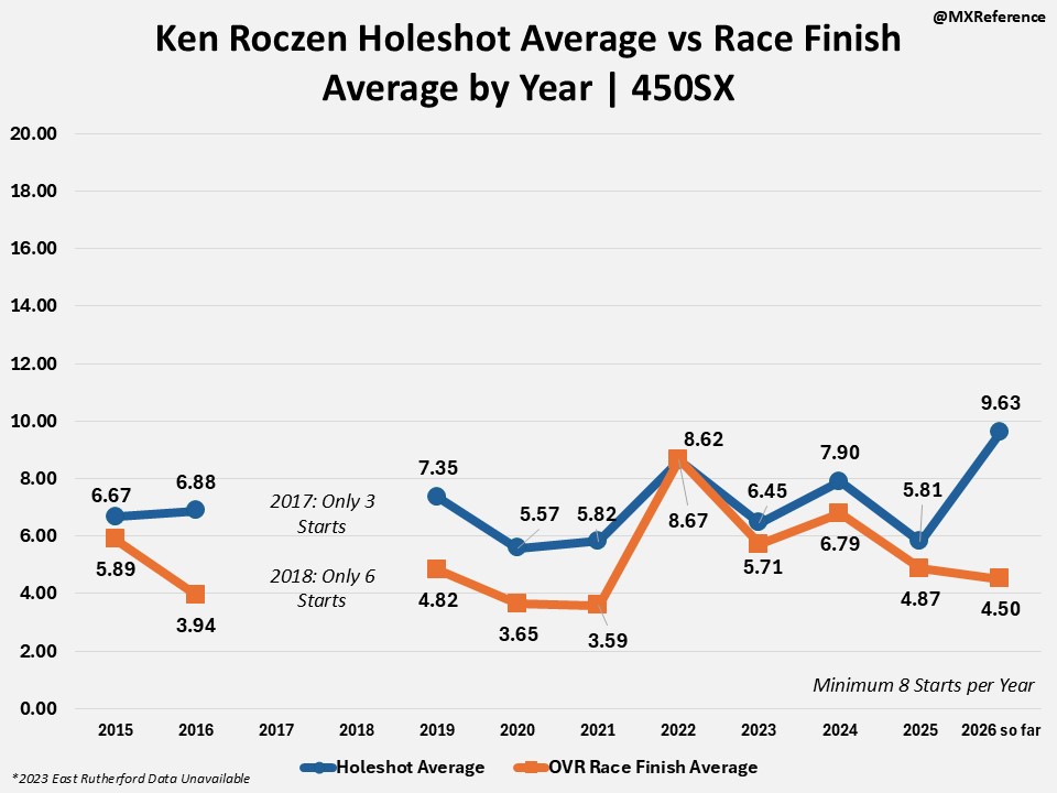 So far through 6 rounds in 2026, Ken Roczen and Chase Sexton have had their personal worst holeshot averages dating back to 2015. (I have holeshot data back until 2015.)