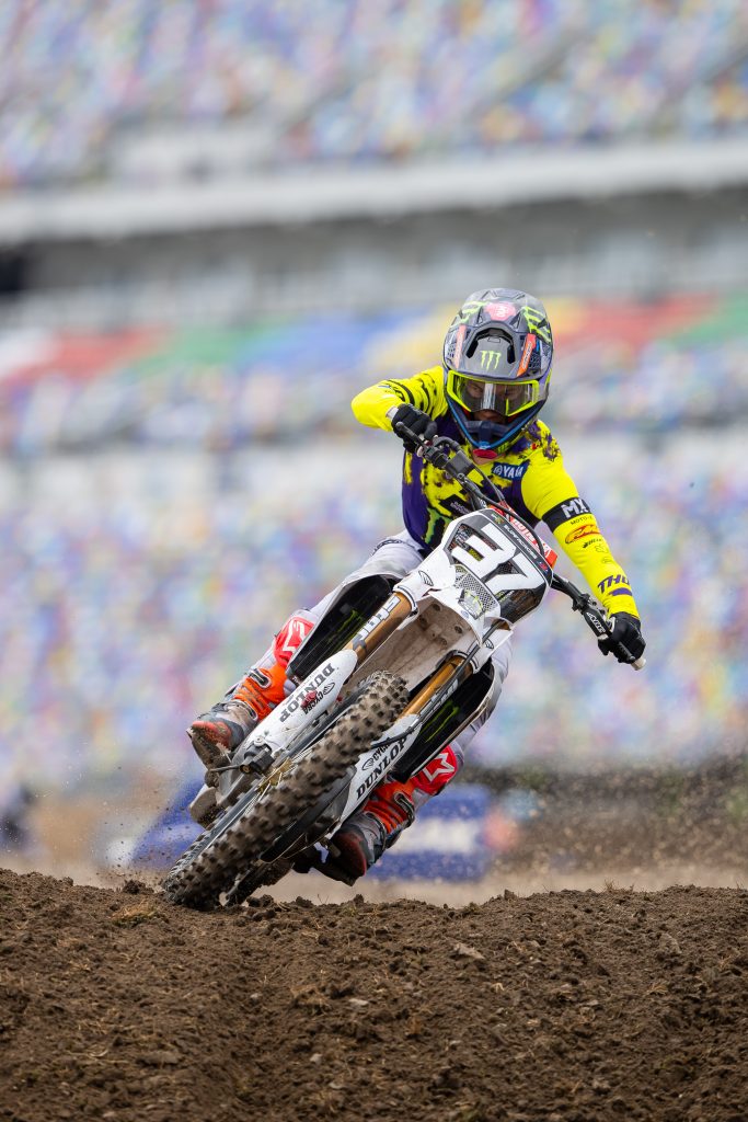 Eli Tomac: Toothless Tomac does it again. Eight times this dude has shredded the crap out of Daytona and from the time his wheels hit the ground on press day you could tell that it was just going to be his weekend. As I was sitting on the floor watching Tomac circulate you could see how much harder he was coming into corners compared to the other riders. He was just simply more aggressive than anyone else through each passing sand corner. He had his trusty scoop on and when Tomac puts a scoop on, you know it’s going to be a tough day for the other riders in his class. Another thing I haven’t noticed before until Daytona was how much he loads his clutch before he hits the first whoop. We all know he rides the clutch a lot but what I didn’t know was how much he loads the clutch before getting into the whoops. This allows the RPMs to build up while in fourth gear. Normally Tomac hits whoops in third gear but in Daytona fourth gear was on the menu. While others may have been sucking wind after the main event, Tomac was snapping trophies off for breakfast.