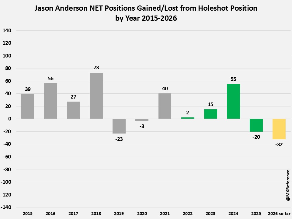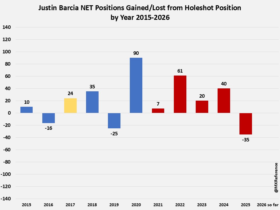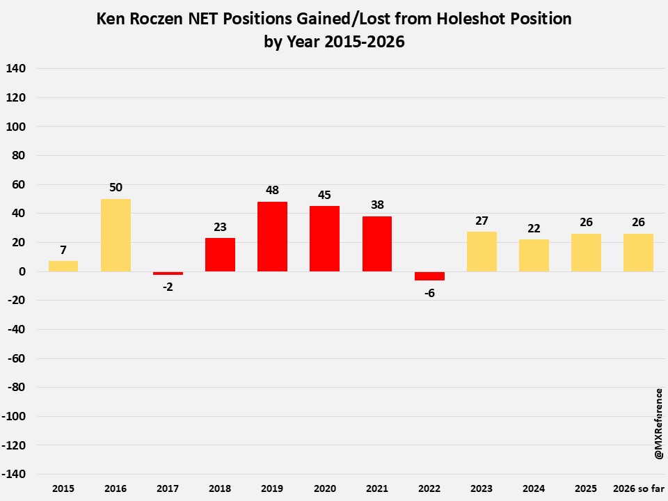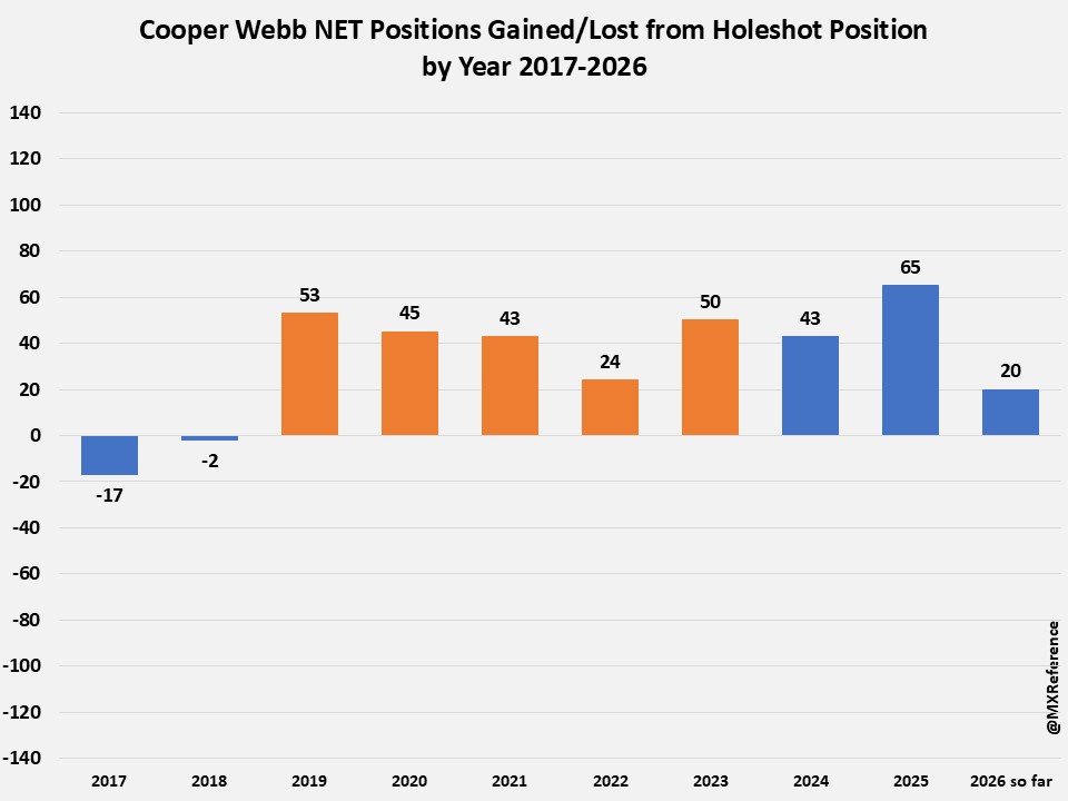 Unfortunately for Tomac in 2023, his starts were so strong that year that he didn’t have a ton of net positions gained. And then in Denver, he lost a ton of spots with the achilles injury which put him negative.