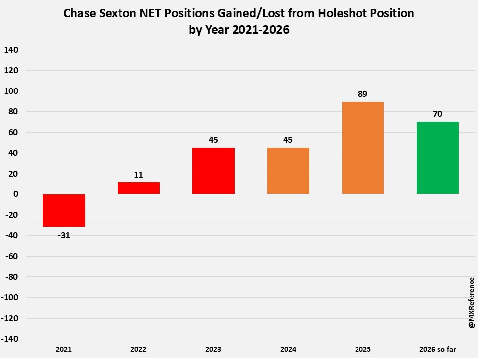 Despite only racing 7 of the 9 races so far this year, Chase Sexton is still way ahead in terms of Net Positions Gained from his holeshot position. Sexton has made up a net of 70 positions from his holeshot position. The next closest is Eli Tomac at 44 positions gained and then Justin Hill at 43 positions gained. This article is being written after round 9 for reference.