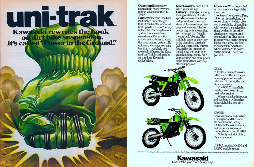 Even though Kawasaki was lacking in sales compared to its rivals, they continued to be at the forefront of motocross innovation. In 1980, they became the first manufacturer to introduce a linkage-equipped single shock rear suspension system with their Uni-Trak. Then, two years later, they became the first Japanese brand to equip their machines with a hydraulic front disc brake. In spite of this innovative spirit, however, the green machines continued to be a tick off the best brands from Europe and Japan.