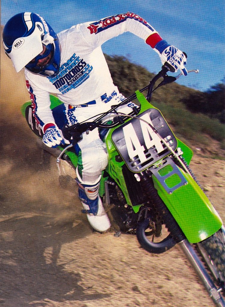 In 1984, Jeff Ward was Kawasaki’s 250 ace. Thankfully for him, his SR250 shared absolutely nothing with the stock KX250 besides the color. Photo Credit: Motocross Action