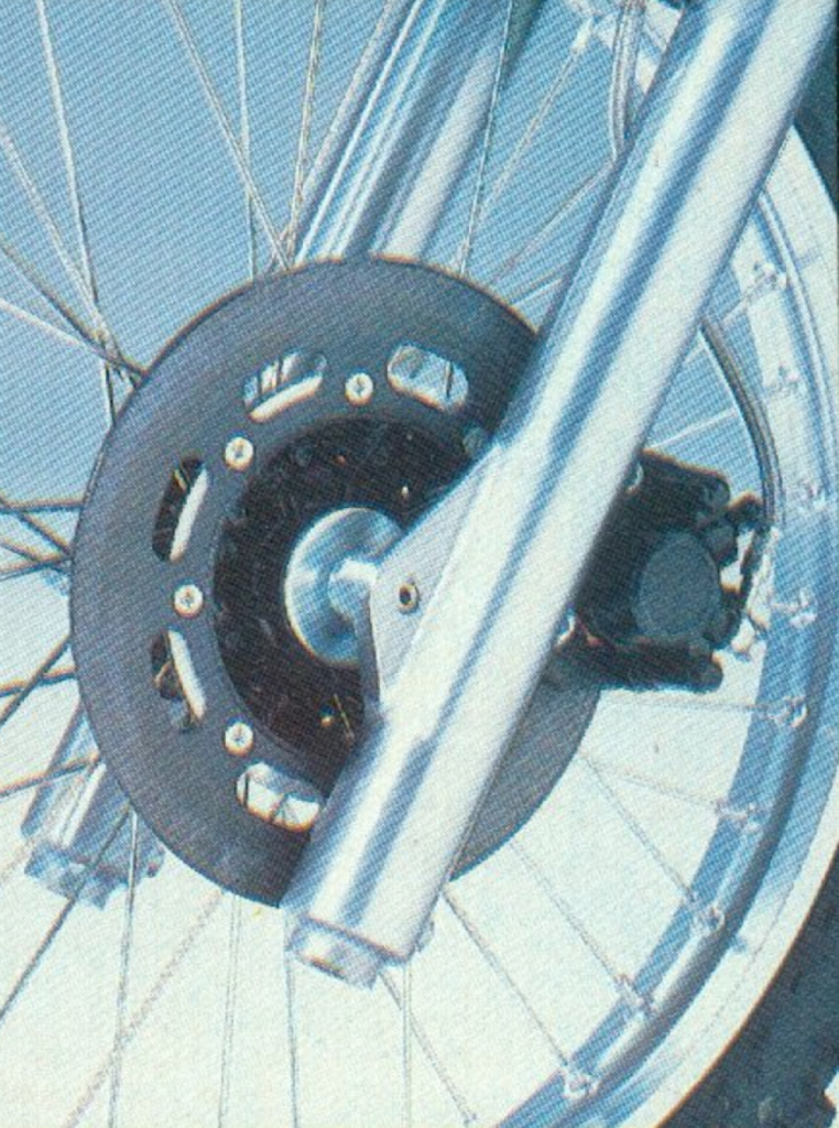 Kawasaki became the first major manufacturer to offer a front disc brake for motocross (unless you count Rokon’s oddball 340 MX-II from the mid-seventies) in 1982. In 1984, the single-piston unit on the KX offered good power, but inferior feel to the excellent dual-piston stopper found on the CR250R. Photo Credit: Kawasaki