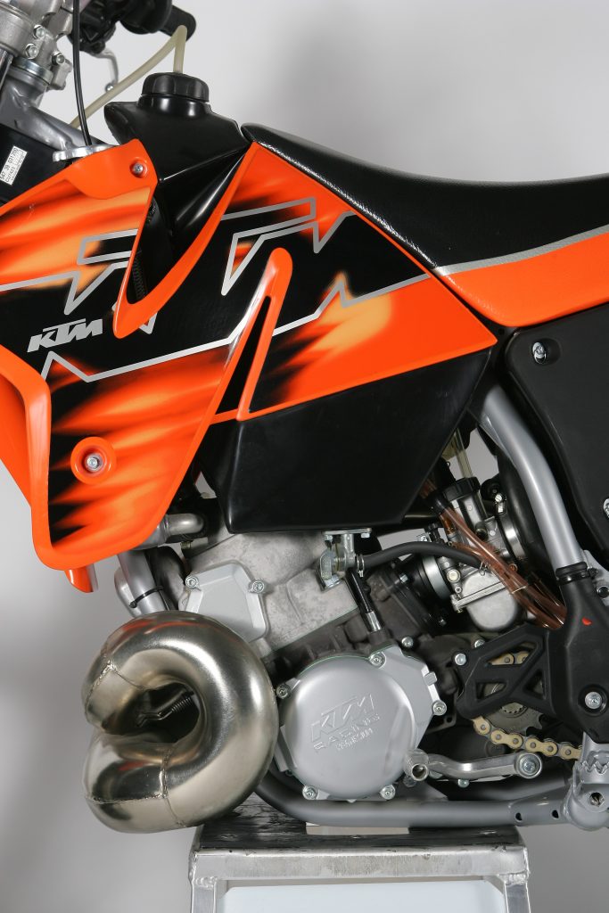 An all-new cylinder for 1998 maintained the case-reed intake of ’97 and added a new ATAC-style resonance chamber to the exhaust port to boost low-end torque. Photo Credit: KTM