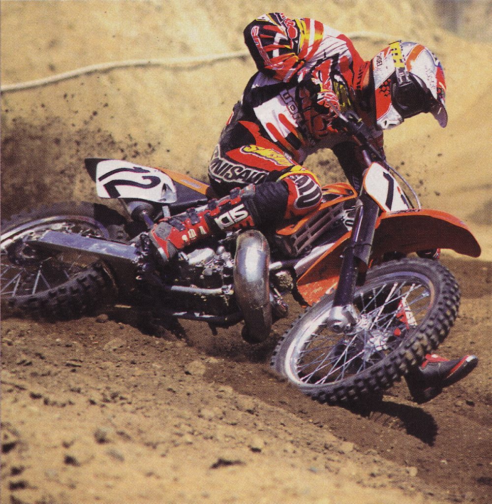 In the chassis department, the new KTM turned out to be a substantial improvement over previous Austrian efforts. The stiffer frame and steeper geometry finally delivered a KTM that could turn. Pilots no longer needed to search the track looking for a rut or berm to bounce off of. Instead, they could dive to the inside and count on the front wheel to hold its line through the turn.
