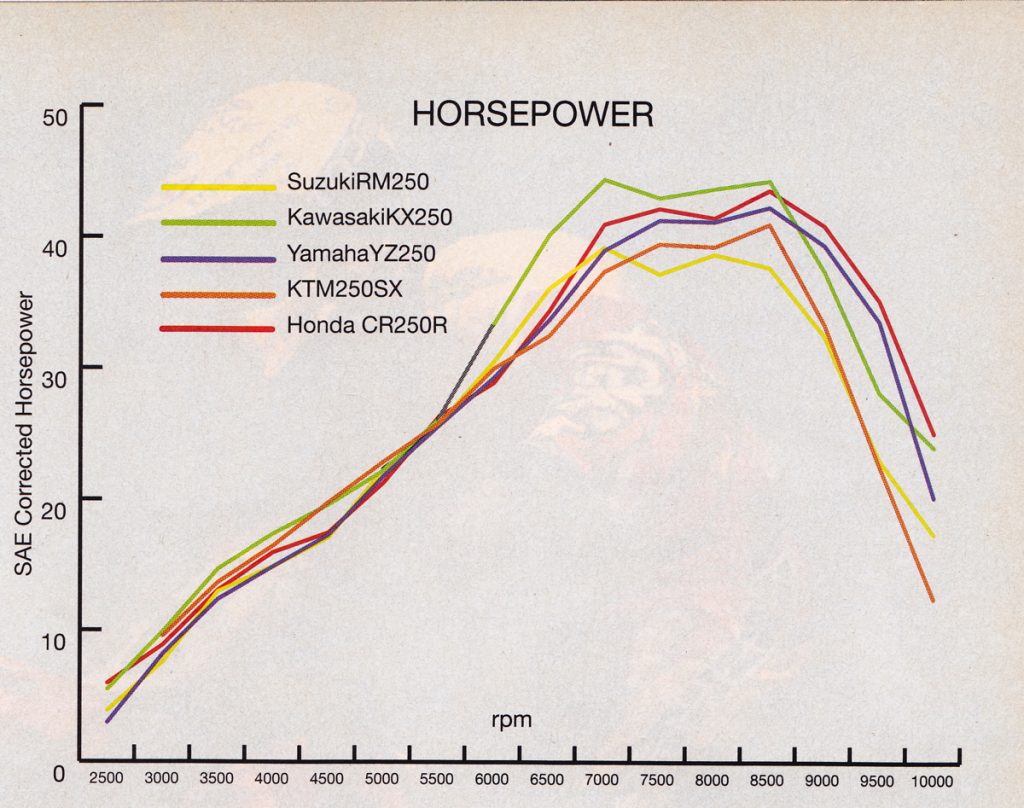 In the horsepower wars of 1998, it really was no contest. The Kawasaki offered the brawniest hit and most power by a wide margin. On top, the CR pulled ahead, but at every other point on the curve, the green machine romped on the competition. Photo Credit: Dirt Bike