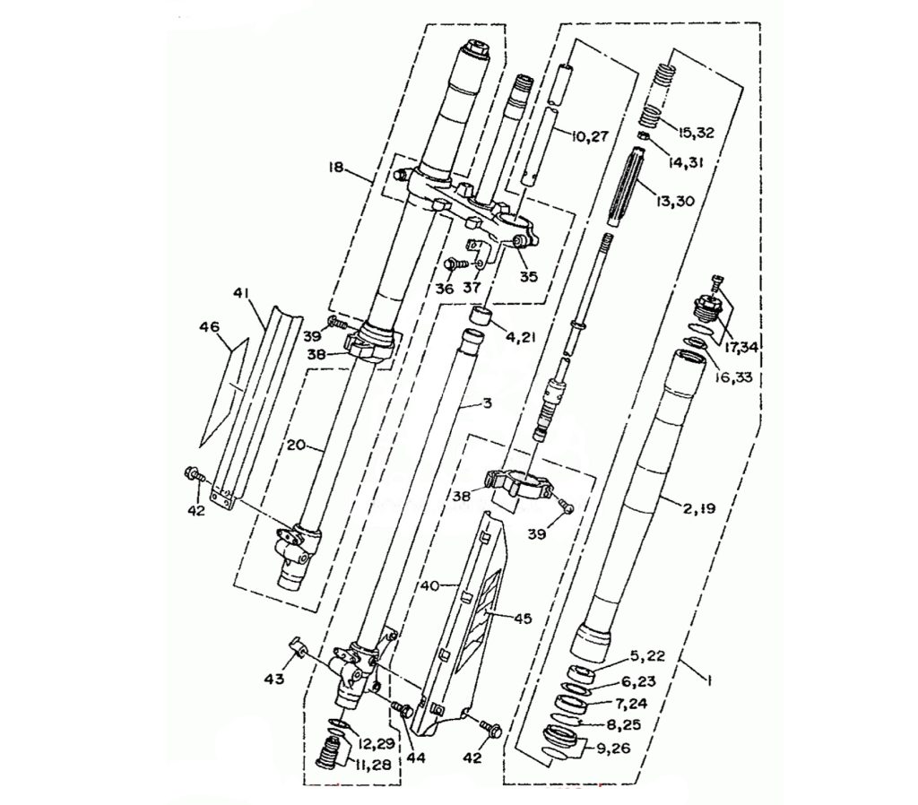 All-new 36mm inverted cartridge fork for 1993 increased chassis stiffness and improved steering precision. Even without any external adjustments, these were the most advanced forks in the class in 1993. Photo Credit: Yamaha
