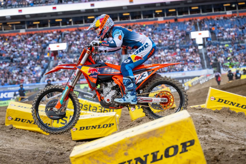 Chase Sexton: I had the pleasure of hanging out with Jade Dungey last Friday to talk about Chase Sextonâs Red Bull KTM and learned a lot. You will be able to check all of the factory bikes we shot on an upcoming Racer X Films soon but I will say I have never heard of a 3D printed titanium footage until now! Wait until you see what these suckers look like! Crazy. Chase has been looking better than ever on the bike and from what Jade told us, he hasnât screwed with his bike much lately. The team brought on a new Akrapovic headpipe for their riders and it is a very unique looking piece. Jade told us that it was supposed to be tested earlier in the week for sound but when Chase rode it, he said it helped power (specifically low end) so the team kept it on the race bikes. Chase dominated Saturday night and I donât see him stopping this weekend neither.Â