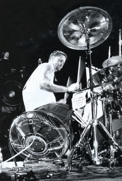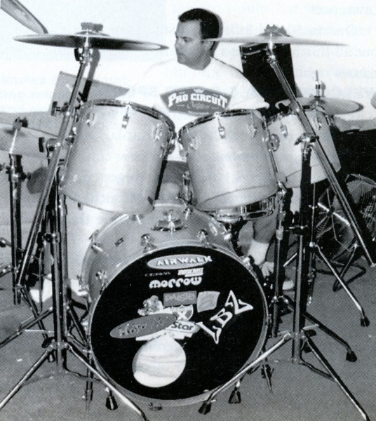 | Owner Erik Sandin at his day job, drumming for the punk band NOFX. |